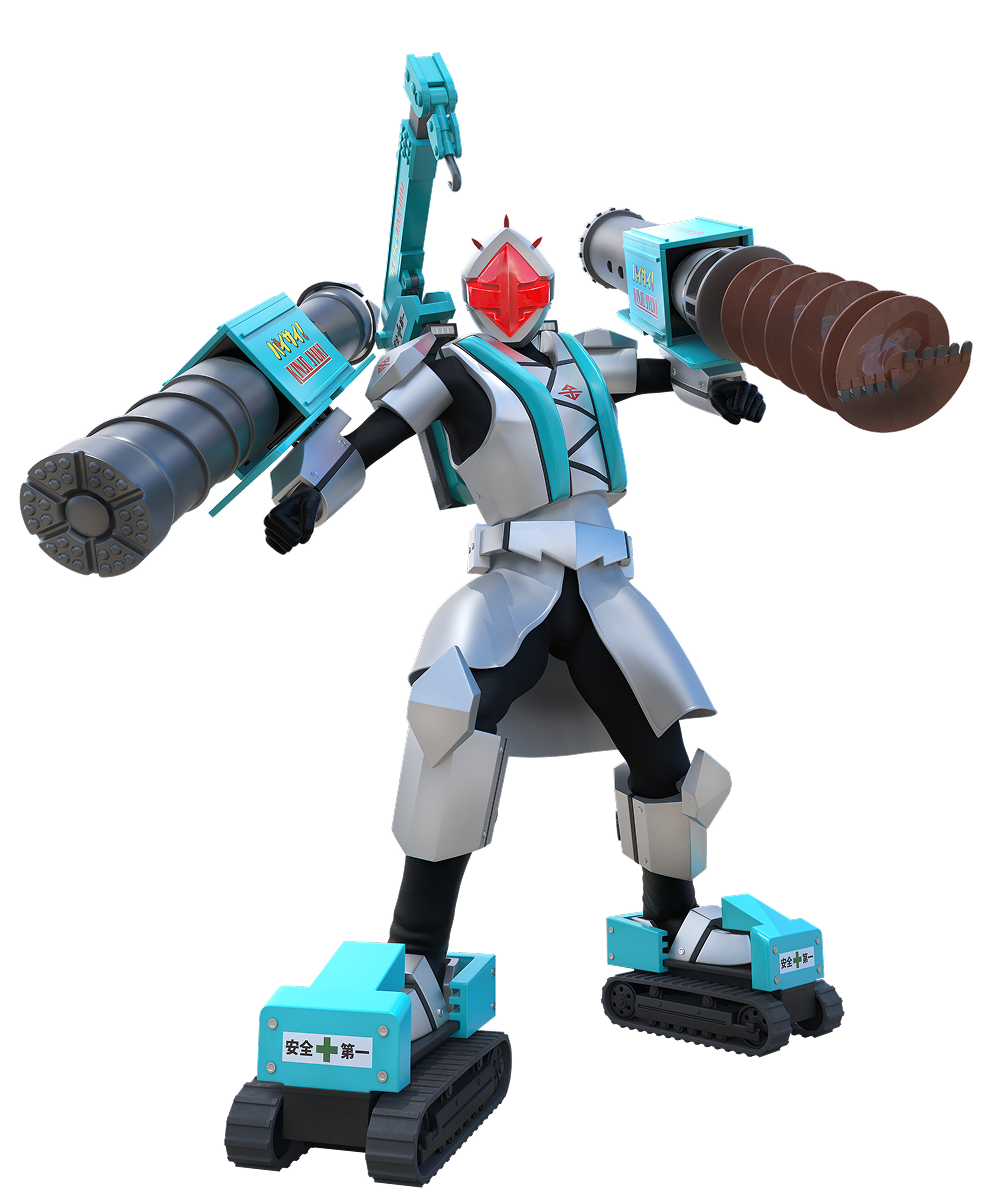 重機戦隊サラバンジ(※1)は、工事の安全の啓蒙活動を行うため、金城重機が企画・デザインしたご当地ヒーロです。